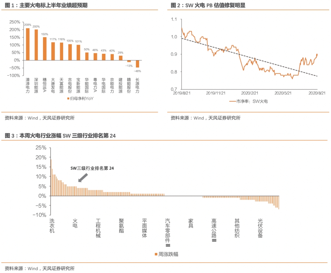 8月18日华能国际披露半年报,业绩大超预期,归母净利润同比高增50%。8月19日SW火电指数高涨4.11%,本周涨幅达4.85%,SW三级行业中排名24,火电行业PB估值修复至0.9。