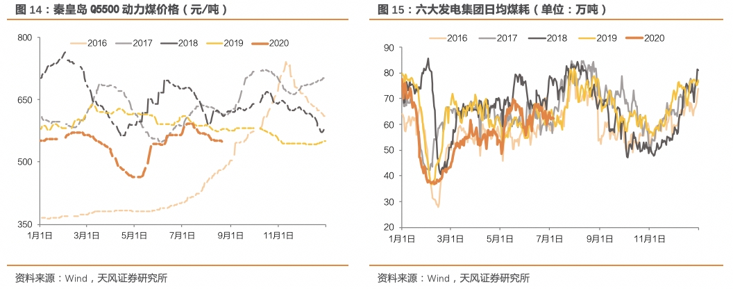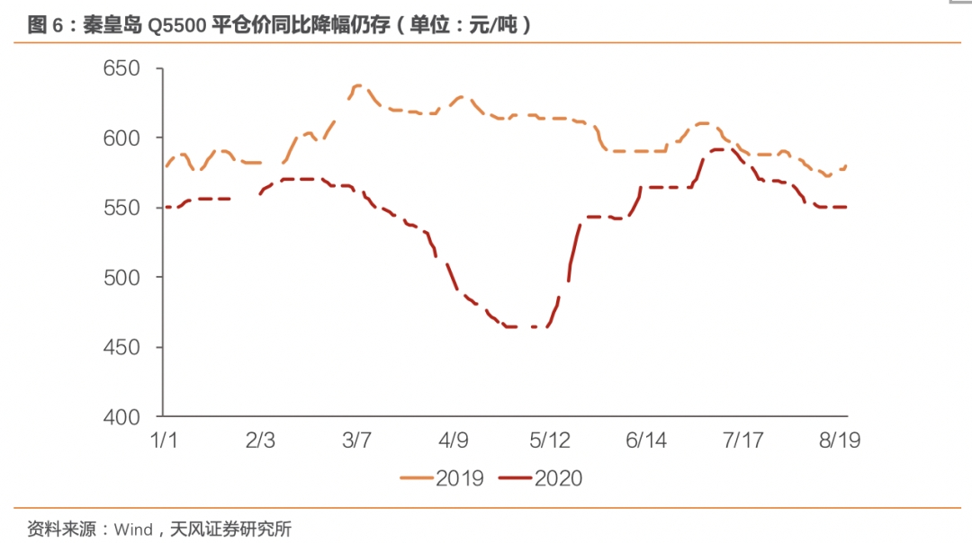 当前时点来看,煤价超预期走高概率不大。一方面,末端需求虽整体向好,但疫情对经济的影响是多方面的,同时国内疫情反弹的风险仍在,末端需求增长完全复苏甚至超过疫情前水平难度较大。另一方面,国际疫情持续发酵,拐点尚难判断,进口煤价格持续走低,这对国内煤价形成一定抑制作用。此外,检修限产、进口煤管控等供给端制约因素难以长期稳固。因此,我们综合供需两端的判断,认为煤价低位运行的趋势不改,超预期走高并无强逻辑支撑。从秦皇岛Q5500平仓价走势来看,在经历了5月以来的抬升后7月开始走低,同比降幅仍存,7月平仓价同比降低约2.81%。