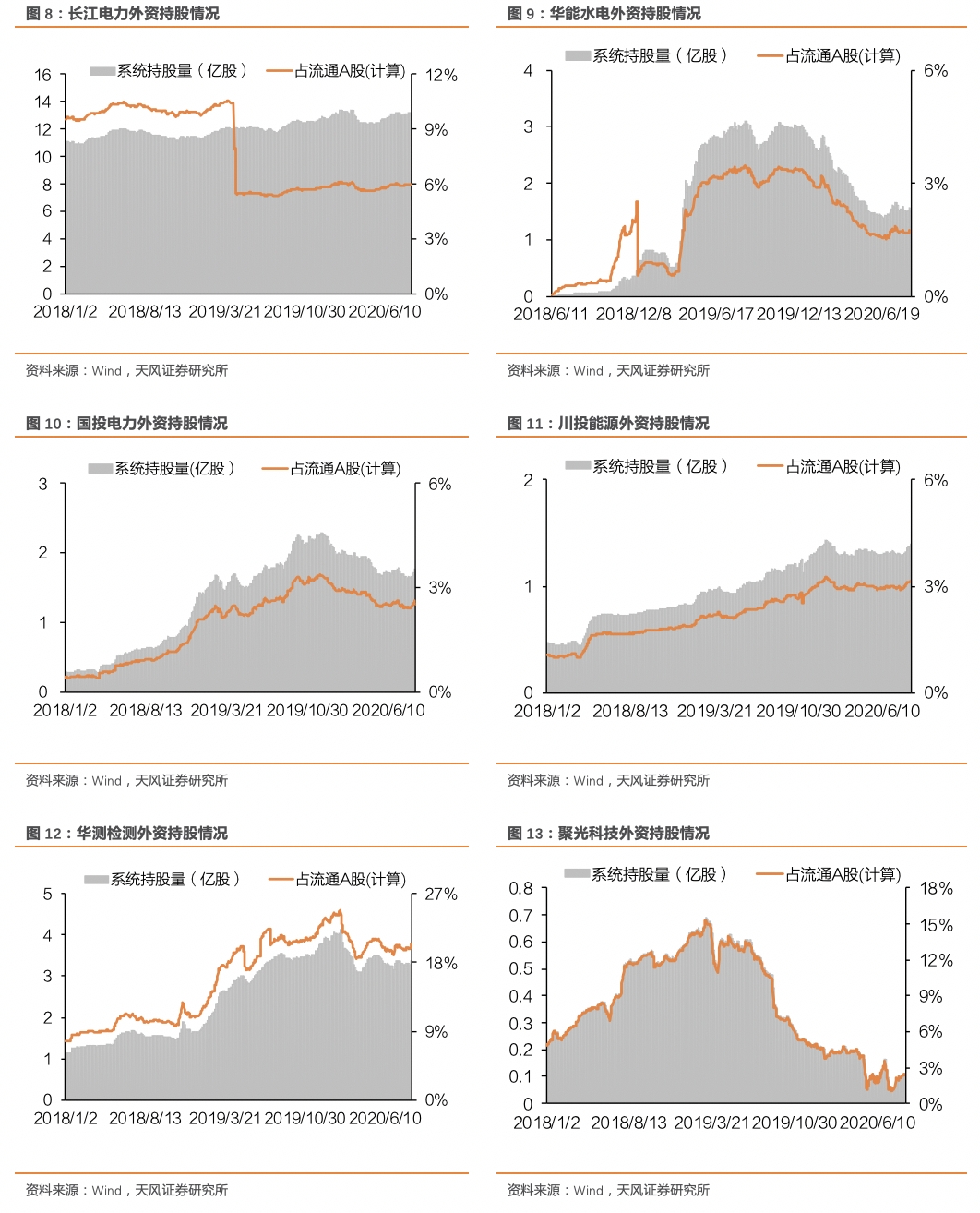 8月21日,剔除限售股解禁影响后,长江电力、华能水电、国投电力、川投能源、华测检测和聚光科技外资持股比例分别为5.96%、1.71%、2.52%、3.16%、20.43%和2.33%。较年初(1月2日)分别变化+0.16、-1.50、-0.56、+0.02、-2.88和-2.30个百分点,较上周分别变化-0.02、+0.02、+0.00、+0.06、+0.64和+0.01个百分点。