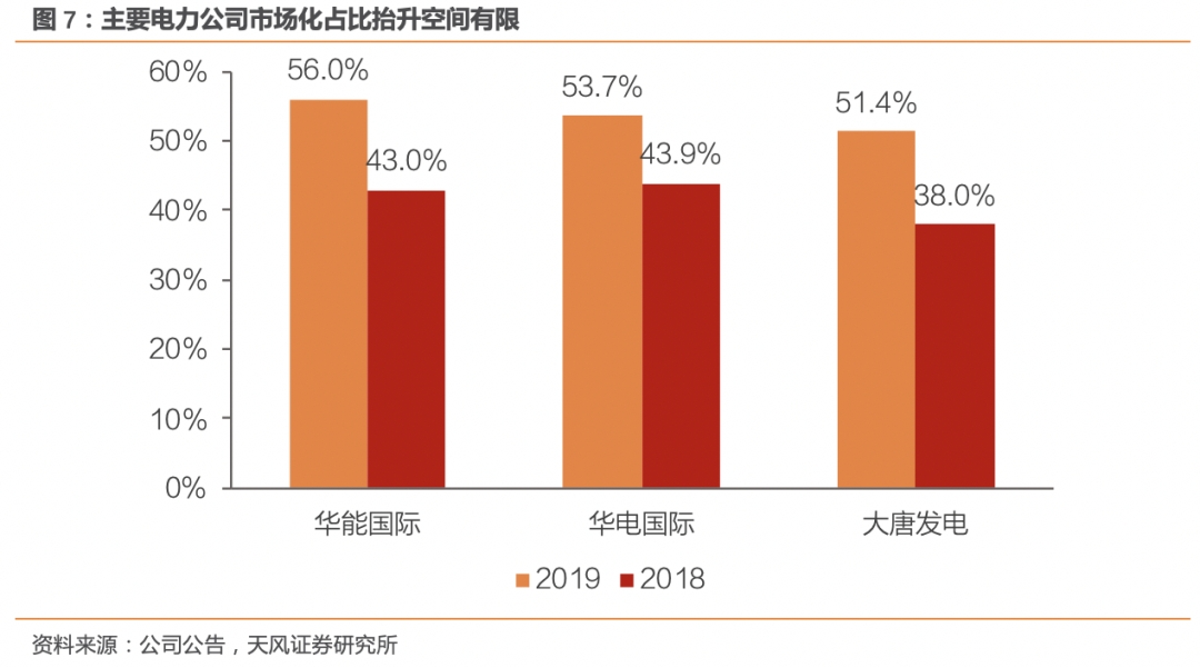 首先,在供给侧寡头垄断格局持续稳固背景下,电企议价能力增强。截至到2018年底,五大发电集团装机容量占全国装机容量的44%,发电量占比48%,发电侧的竞争格局已定,寡头垄断的行业格局明显。同时,上半年煤电资源整合节奏加快、趋势明晰。上半年国资委发布了《关于印发中央企业煤电资源区域整合第一批试点首批划转企业名单的通知》的文件,整合目标为力争到2021年末,试点区域产能结构明显优化,煤电产能压降四分之一至三分之一,供给侧寡头垄断格局进一步巩固。另一方面,主要电力企业市场化占比已较高,提升空间不足。由于居民用电、重要公用事业和公益性服务等行业不参与市场化交易,我们判断火电企业的市场化上限在70%左右,主要火电企业市场化占比超50%,市场化规模扩大对综合电价影响较小。
