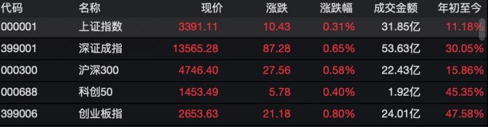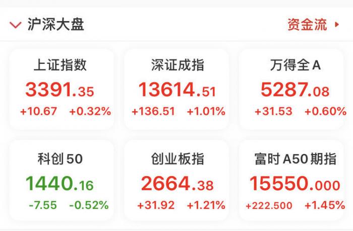 10:45,A股开盘一小时后,创业板指涨深V后涨1.2%,深证成指涨1.1%,上证指数涨0.3%。而科创50跌 0.5%。