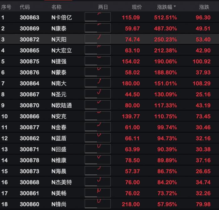 开盘一个小时后,18只创业板注册制新股,10只涨幅超100%,其余8只涨幅皆超过50%。涨幅最高的是N卡倍亿,涨512%。