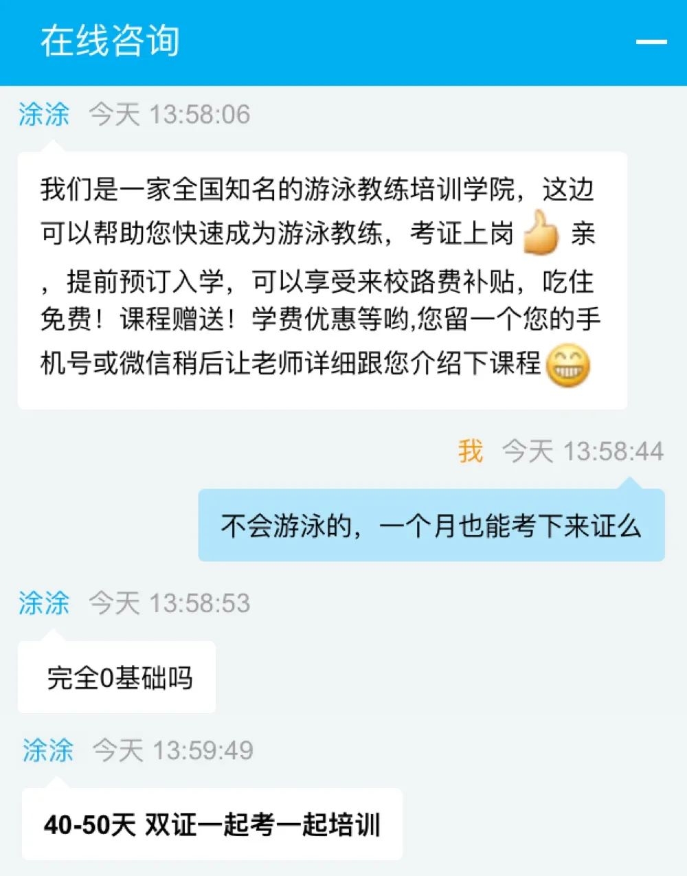 目前市面上的游泳俱乐部,很多都是由退役的运动员开办。但部分学员表示,其实教练“会游”就可以了。真正想要在游泳上有所造诣的学员,相应会对教练的水平要求更高。参与游泳培训的学员大多都是初学者,所以对于教练自身的游泳能力并无过多要求,真正可以影响到学员选择的是教练员授课时的耐心、细心程度。但是无一例外,游泳教练员和救生员必须要有《游泳救生员国家职业资格证书》和《游泳社会体育指导员国家职业资格证书》双证在手,方可从事相关工作。在熟练各类游泳技能,教练员还需掌握急救、CPR、潜泳技术等相关专业知识。此类证书培训一般30天就能完成,完全0基础的也能在两个月内完成。教练速成,几乎没有门槛。