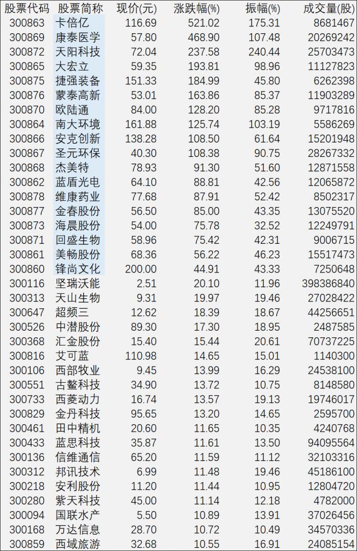 早盘收盘,共有37只创业板股票涨幅逾10%,领涨的18只个股是首批上市的、号称“十八罗汉”的创业板新股。涨幅最大的是N卡倍亿,涨幅达521.02%。