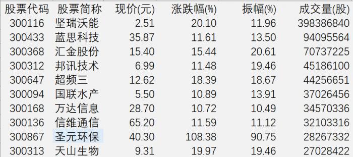 涨幅逾10%的创业板个股(按成交量排序)(前十)
