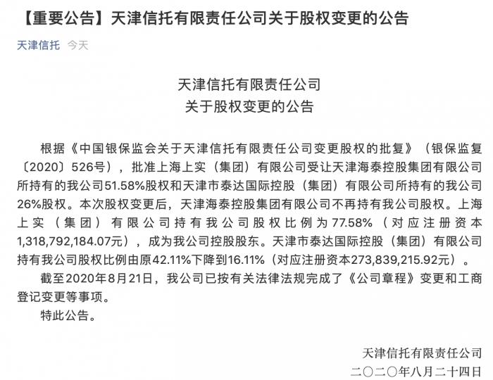 8月25日,天津信托微信公众号发布公告称,银保监会已批准上海上实(集团)有限公司(下称上实集团)受让天津海泰控股集团有限公司(下称海泰控股集团)所持有的天津信托51.58%股权和天津市泰达国际控股(集团)有限公司(下称泰达控股)所持有的天津信托26%股权。