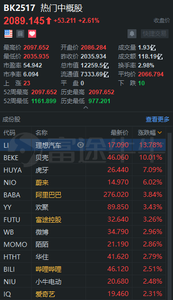 在美上市中概股收盘多数上涨,共有168只中概股上涨,105只下跌。