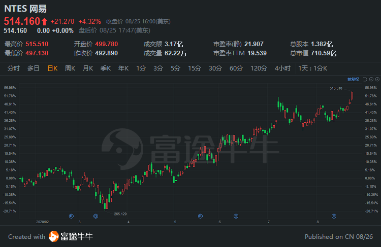 网易(NTES.US)收涨4.32%,该公司盘中市值首次超700亿美元。