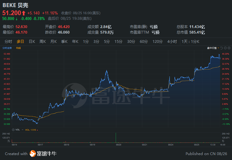 贝壳(BEKE.US)大涨11%,报51.2美元,已连涨三日。13D文件显示,腾讯通过Tencent Mobility和Sunshine Peak在贝壳找房IPO中以总计1.60亿美元购得800万股美国存托股票。8月21日,Tencent Mobility以7020万美元的总价从Knight Ray购得1050万股。腾讯控股在13D中报告持有贝壳找房16.5%的股份。