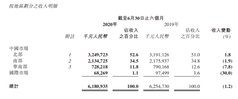 李宁近两年按地区划分收入情况