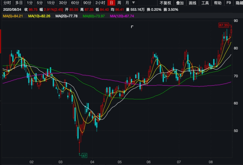 截至8月24日,李宁股价报收于34.20港元/股,市值为848亿港元,不足晋江系龙头安踏体育(2020.HK)市值的四成。