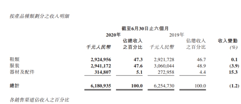 从2020年上半年营收构成来看,其鞋类产品实现营业收入29.25亿元,同比增长0.1%,占总营收的47.3%;服装类产品实现营业收入29.41亿元,同比下降3.9%,占总营业的47.6%;器材及配件类实现营业收入3.15亿元,同比增长15.3%,占总营收的5.1%。