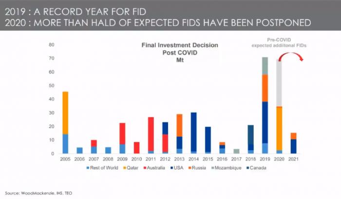 博宏指出,实际上,疫情对需求端的影响是比较小的,受影响的部分只有1500万吨,而总的需求量是3.6亿吨。疫情的影响主要体现在供给端上,随着石油价格走低,很多项目被推迟,很多企业没有像原计划那样迅速做出最终投资决定(FID)。