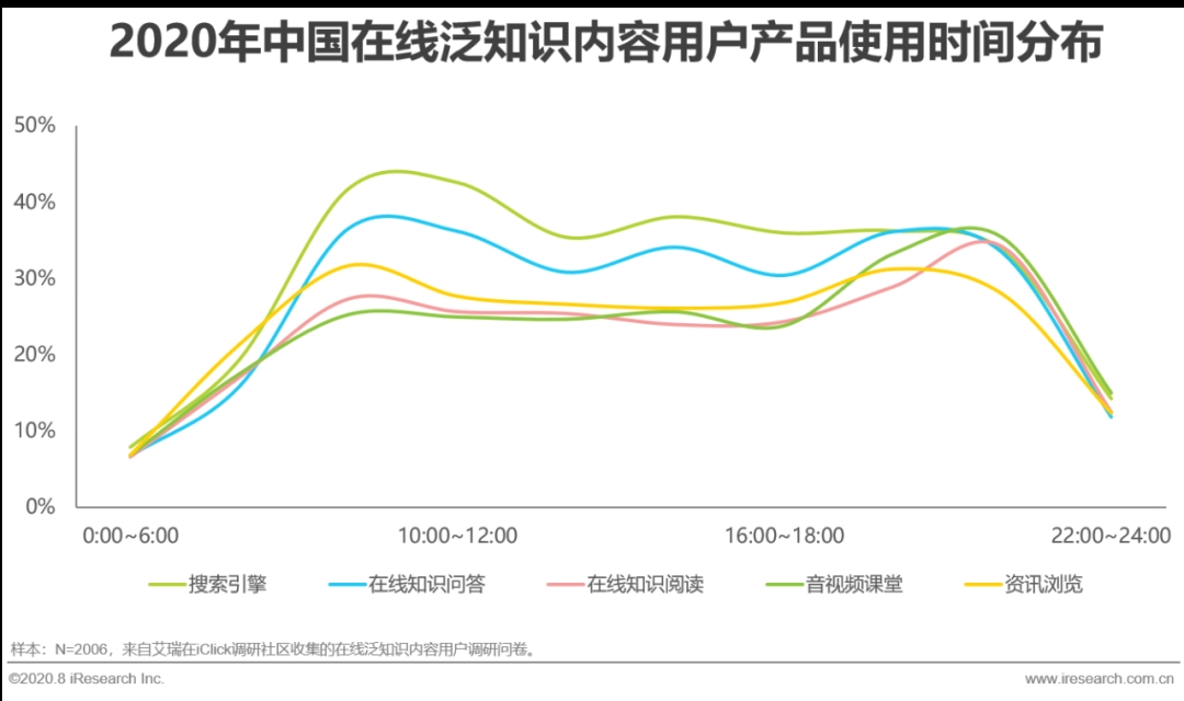 根据调研数据的结果显示,在不同种类获取知识行为所对应的产品中,搜索引擎与在线知识问答具有明显更高的用户渗透率,使用占比均超过80%。而从使用时间分布来看,这两类功能的使用率在上午和下午时段达到峰值,在线知识问答在夜间亦具有一次峰值。
