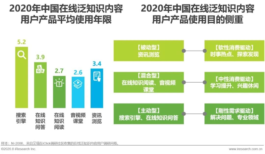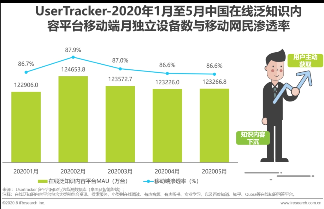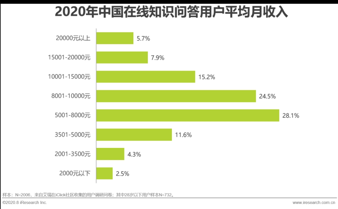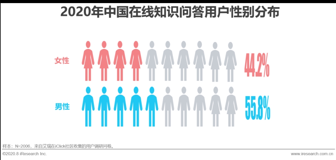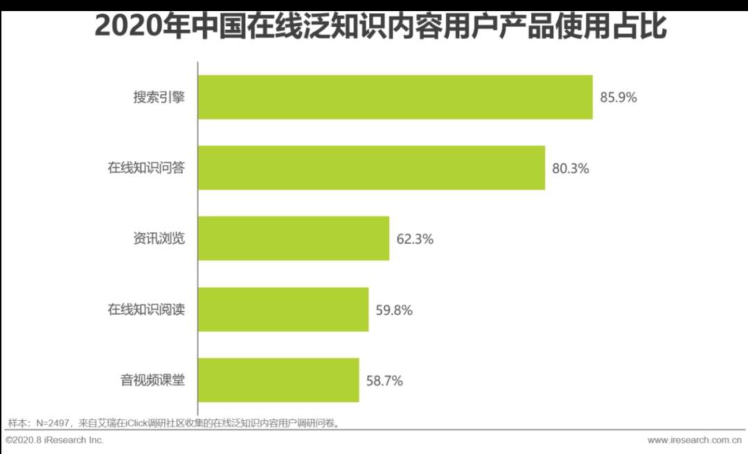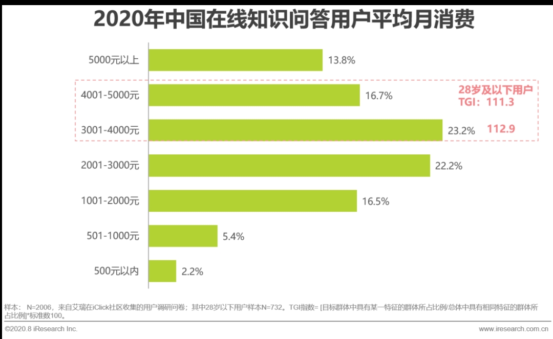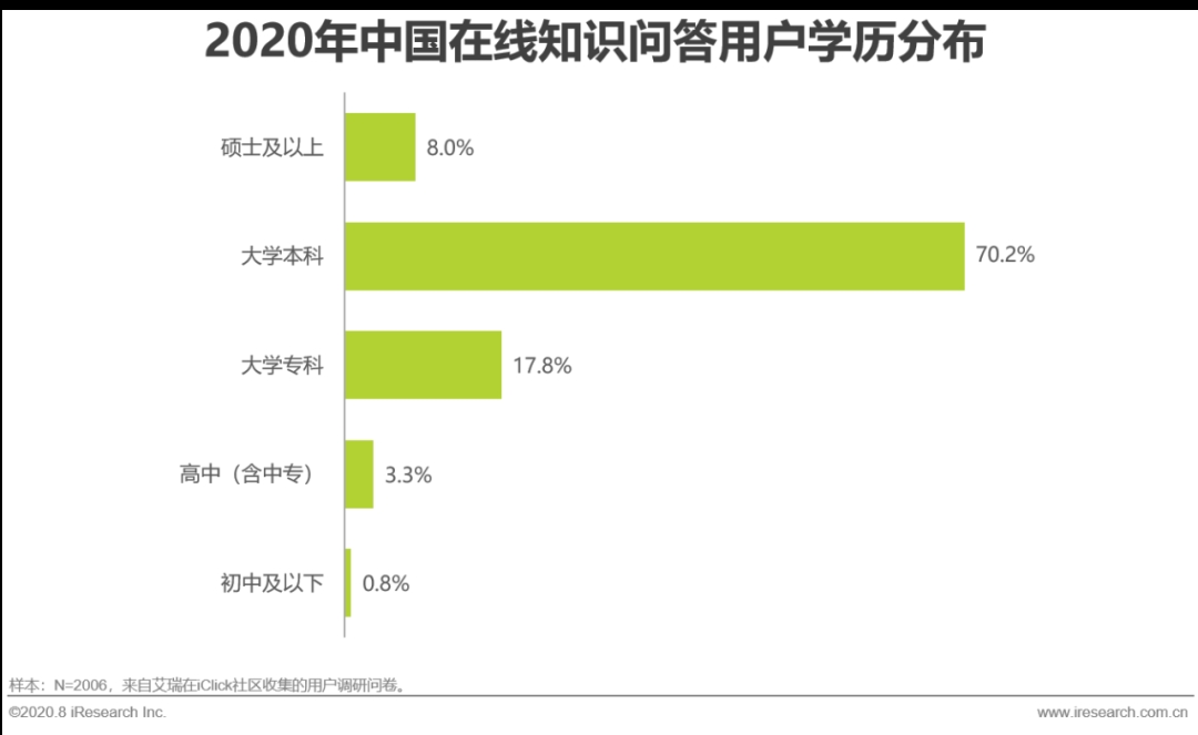 艾瑞咨询发布的《2020年中国在线知识问答行业白皮书》,2020年中国泛知识内容行业成长为千亿级别的市场,移动端网民渗透率平均已达到86%以上,81.4%的知识问答用户月收入超过了5000元。