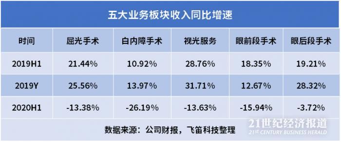 爱尔眼科主要收入来自五大板块,分别是屈光手术、白内障手术、视光服务、眼前段手术、眼后段手术。上半年各个业务板块表现如何?