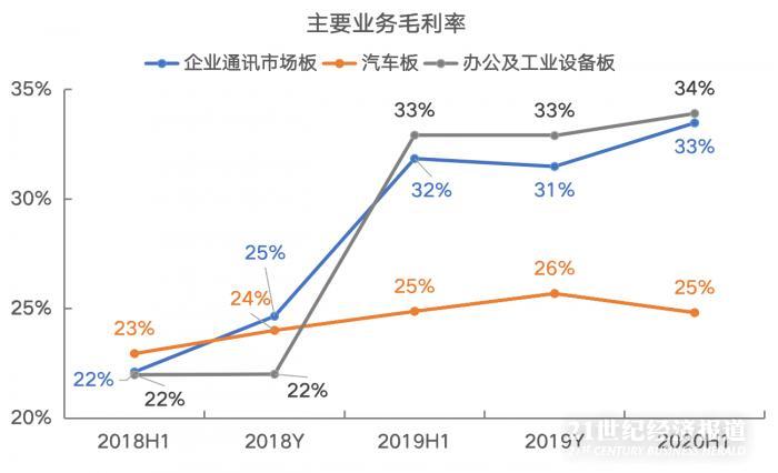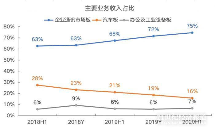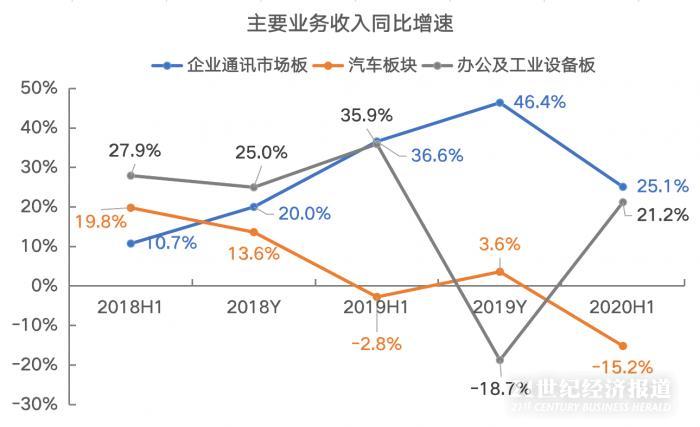 公司上述三个板块的横向业务表现,基本跟下游产业的景气情况匹配。但是如果只看公司企业通讯市场板业务的表现,今年上半年同比增长25.1%,跟去年上半年36.6%的同比增速相比,明显放缓。