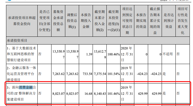数据显示,宇信科技面向消费金融公司的IT整体解决方案建设项目募资资金承诺投资总额为8023.07万元,报告期内实现的效益为429.99万元。