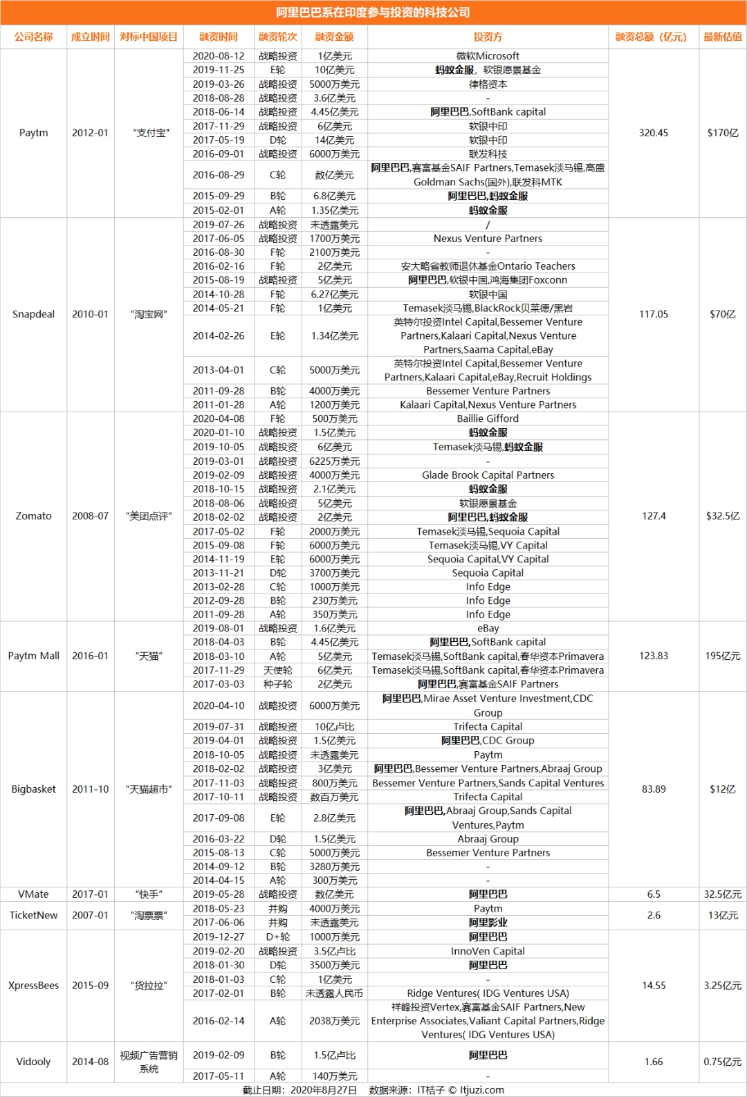 根据 IT 桔子数据,2020 年阿里公开披露的在印度投资仅有 2 笔。1 月,蚂蚁金服以 1.5 亿美元战略投资印度「美团点评」Zomato;4 月,阿里巴巴以 6000 万美元战略投资印度「网上商超」Bigbasket。过去 4 个月时间里,阿里并没有在印度出手,且未来至少半年不会在印度投资。