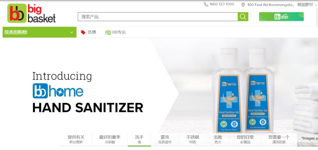 印度 bigbasket 网站正在推广销售洗手液产品