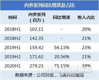 内参酒系列是公司主打高端的白酒,中报和年报会公布分系列酒的收入情况。上图将这一数据折算成半年度数据,从中可以看到,上半年公司的内参系列酒高速增长,同比增速高达75.15%。收入占比从去年下半年的21%跃升到39%。高端白酒消费需求增加,这也符合上半年白酒行业发展的特点。