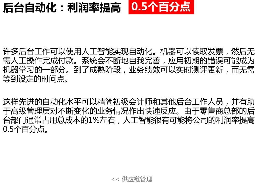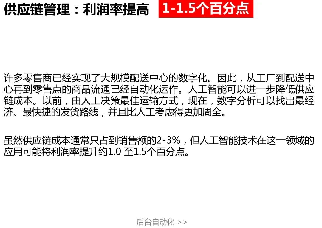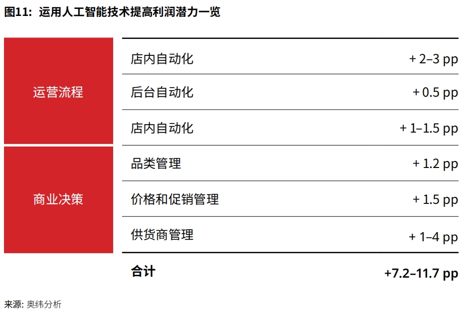 我们认为人工智能可以帮助零售商提高销售、降低成本,营运利润率可提升达4个百分点,商业利润率可提升6个百分点(见图11)。这还只是未来五年可实现的基本优化潜力。中长期潜力包括:为消费者定制个性化体验,预测新产品销售情况以及机器人自动化。