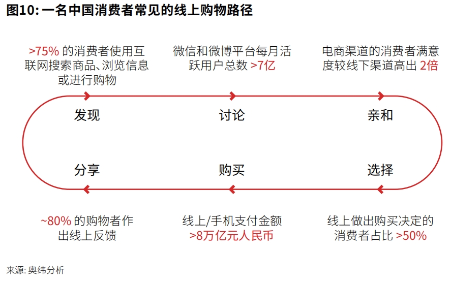 阿里巴巴、京东等本地数字化零售巨头的迅速崛起与快速的线上驱动数字化息息相关。它们通过收购和自主培育的方式构建零售活动的各个环节,包括数字支付应用软件、快递公司和社交媒体以创造需求(见图10)。它们还收购实体连锁店,让消费者可以在下单前从店铺寻求建议并查看商品,以此作为线上数字化效率的补充。对于传统零售商来说,这是最令人担忧的。因此,中国零售企业对应用数字化和人工智能技术的紧迫感越来越强烈。最近的一项调查显示,超过四分之三的企业高管预测在未来五年,人工智能将给整个行业带来“真正的颠覆”。