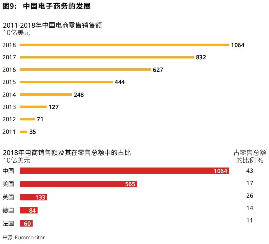 我们以中国为范例,一窥人工智能技术的潜在影响。中国已跃然稳居全球线上零售的前沿,2018年电子商务占零售额比重超过40%(见图9)。英国同期占比为26%,而其他主要市场的占比更要小得多:美国17%,德国14%,法国11%。