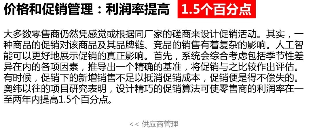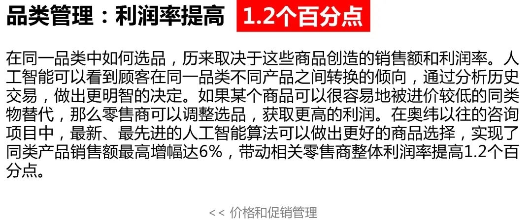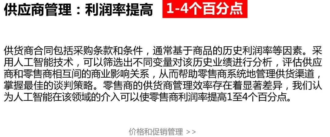 然而,希望仍可企及。我们近来的经验表明,实体零售如果积极实施高瞻远瞩的人工智能应用项目,不仅可以应对竞争威胁,更可能从经济效益的角度改变竞争格局。我们看到一些实体零售商在纳入人工智能技术后,实现利润率提升10个百分点。在运营方面,收益来自于更智能化的店内流程、后台自动化和更完善的供应链管理。通过对品类、供应商、价格和促销的卓越管理,商业决策也日臻完善。长期以来,传统零售业的平均净利润率低得可怜。以此为起点,部分优化完善就会带来财务状况的巨大提升。