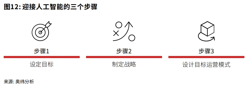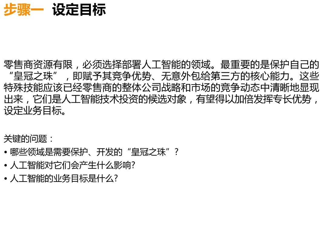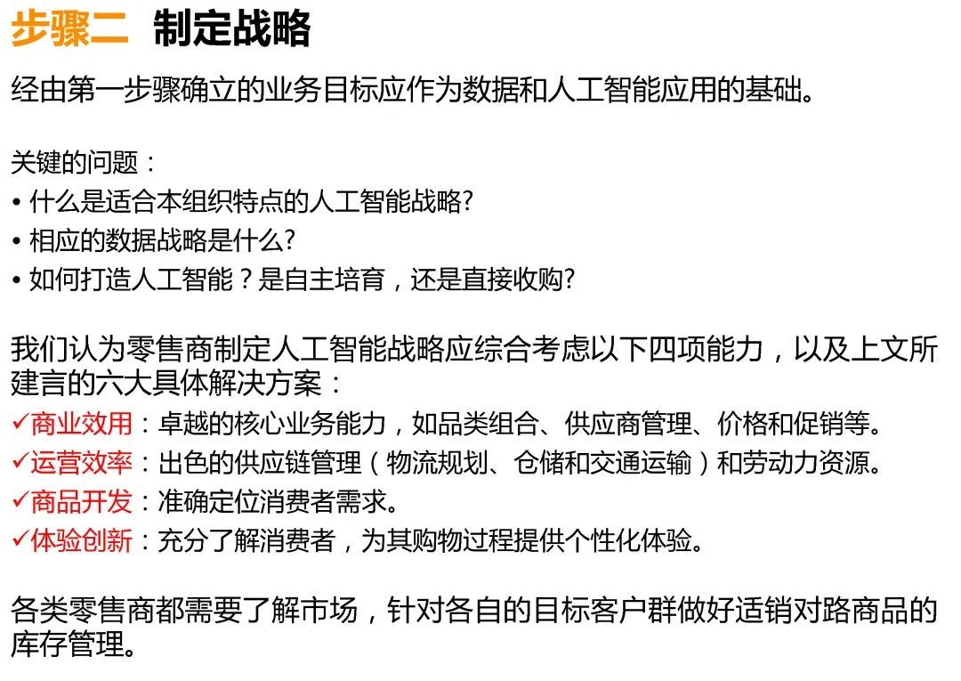 近半参与奥纬中国市场调研的零售企业高管表示,愿意将5%的销售额投入发展人工智能技术。然而,人们普遍认为企业培育人工智能是相当繁复的,技术挑战包括如何保质保量获得数据、如何编写代码,以及如何生成具有操作性的结论。最简单的方法是提出正确的问题,携手经验丰富的合作伙伴开发正确的技术,同时意识到培训和招聘一支人工智能团队所涉及的各种挑战。我们建议采用如下三步骤流程 (见图12)。