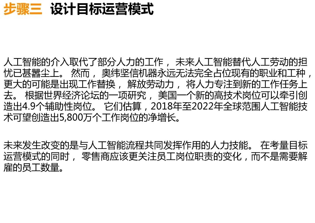 人工智能可以帮助或取代从事重复性、低价值工作的员工,从而将劳动力释放去提供优质服务。员工可以负责熟食柜台、提供试吃服务、回答消费者问题,赋予店铺人性化体验,鼓励消费者回归实体店铺。