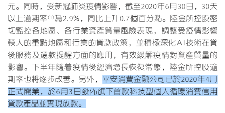 在中国平安的中报中,平安消费金融的介绍放到了陆金所控股板块中,业绩报提到:平安消费金融公司已于2020年4月正式开业,于6月3日发布旗下首款科技型个人循环消费信用贷款产品并实现放款。
