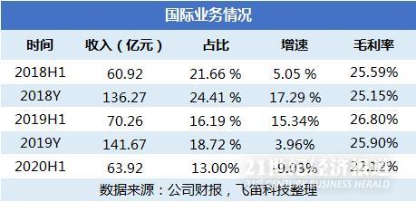 各细分业务毛利率均有所下降,国际业务收入下滑