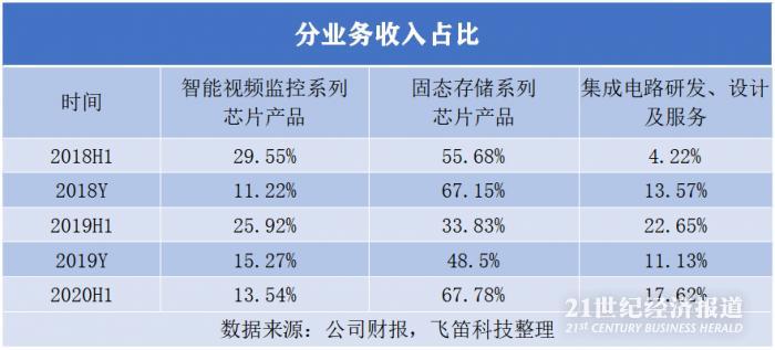 公司三块业务中,固态存储系列芯片产品和集成电路研发、设计及服务的毛利率变化也很大。跟2019年年度相比,今年上半年,公司三块业务的毛利率都明显下滑。
