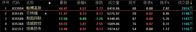 成交额来看,翰博高新(833994)、贝特瑞(835185)、殷图网联(835508)、连城数控(835368)、观典防务(832317)5只个股成交额皆过千万元,为成交额为前五名,分别为2816万元、2748万元、1183万元、1166万元、1156万元。