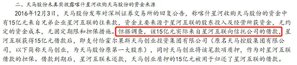 徐茂栋收购*ST天马时曾表示,交易资金全部来源于自有或自筹资金,不包含任何杠杆融资结构化设计产品,但根据证监会此后立案调查结果,徐茂栋收购*ST天马控制权时的15亿元资金实际来自星河互联向信托公司的借款。