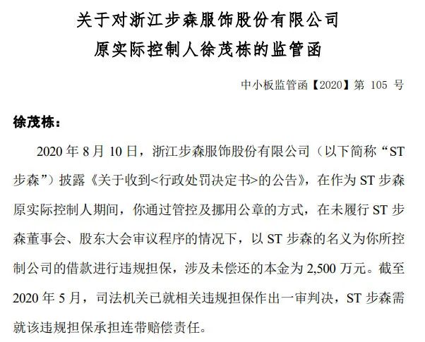 根据交易所2020年8月下发给ST步森的《行政处罚决定书》和《监管函》,原实控人徐茂栋通过管控及挪用公章的方式,在未履行ST步森董事会、股东大会审议程序的情况下,先后与2017年9月和2017年10月,两次以ST步森的名义为其所控制的*ST天马借款事项提供担保。