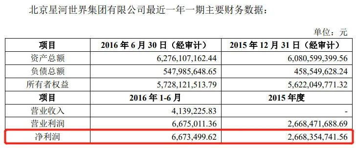 根据*ST天马彼时披露,截至2015年末,星河世界的总资产达60.8亿元,净资产56.2亿元;2015年营业利润和净利润均达到26.68亿元,但2016年上半年净利润仅有667.35万元。