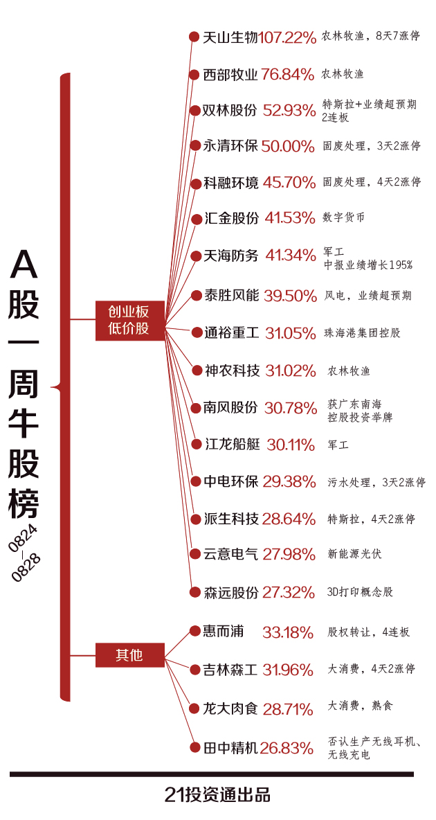 纵观20大牛股,创业板低价股占据了8成。除了天山生物外,西部牧业(300106.SZ)、双林股份(300100.SZ)、永清环保(300187.SZ)周涨幅也在50%以上。