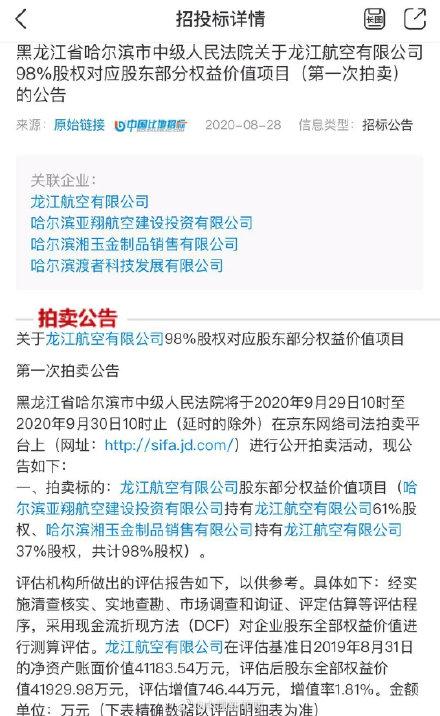 拍卖标的为龙江航空有限公司股东部分权益价值项目(哈尔滨亚翔航空建设投资有限公司持有龙江航空有限公司61%股权、哈尔滨湘玉金制品销售有限公司持有龙江航空有限公司37%股权,共计98%股权),时间为2020年9月29日10时至2020年9月30日10时。