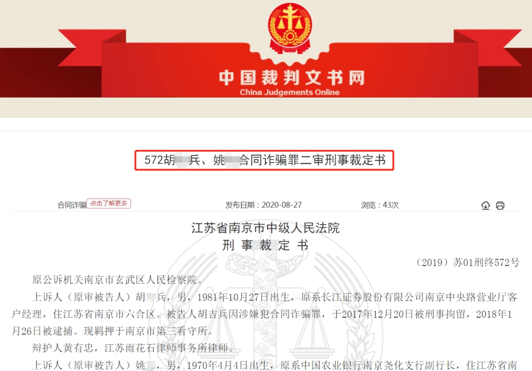 近日,中国裁判文书网公布了对胡某兵和姚某合同诈骗罪的二审刑事判决书,这起跨越数年的大案终于尘埃落定。