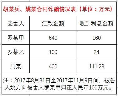 具体来看,被害人罗某甲、罗某乙、周某分别先后向被告人胡某兵的个人账户汇款共计540万元、100万元、400万元,被害人罗某甲还向被告人姚某的个人账户汇款人民币100万元。2017年,姚某向被害人罗某甲归还人民币100万元。