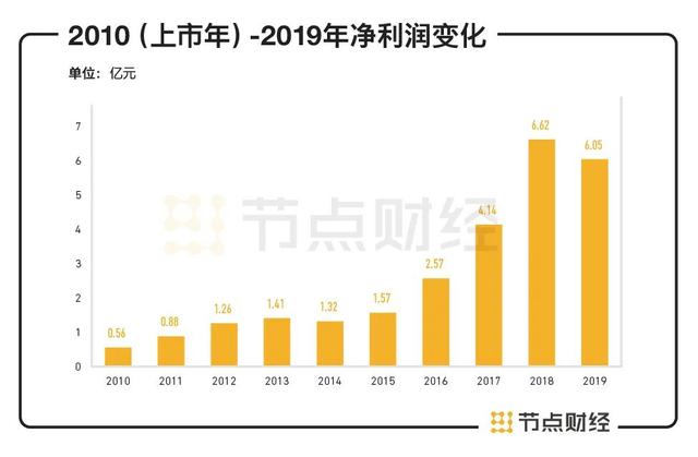 上市当年,涪陵榨菜的净利润为0.56亿,此后到2018年,净利润分别0.88亿、1.26亿、1.41亿、1.32亿、1.57亿、2.57亿、4.14亿、6.62亿,6.05亿元。9年时间,净利润翻了近4倍。