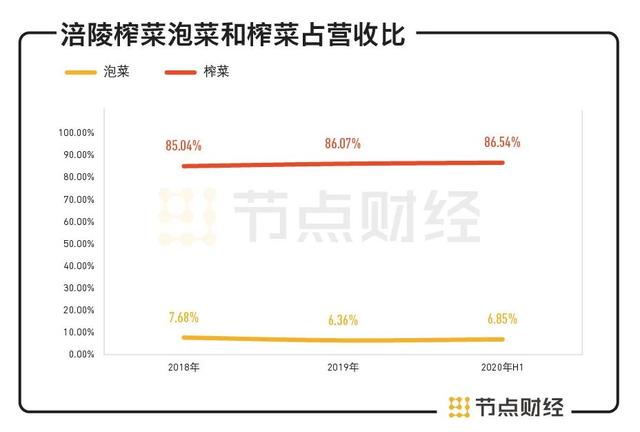 2020年上半年,泡菜占总营业收入的6.85%,榨菜占86.54%。也就是说,在未来很长一段时间内,榨菜都将是涪陵的主要收入。