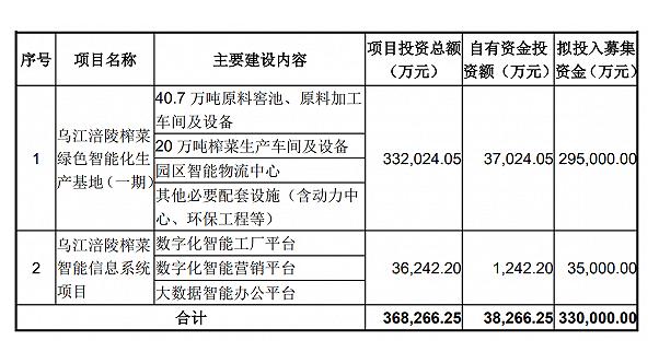 值得一提的是,在公布半年报的同时,涪陵榨菜披露非公开发行股票预案。本次发行对象为包括涪陵国投及周斌全在内的不超过三十五名特定对象,涪陵国投为公司控股股东,周斌全为公司董事长,涪陵国投及周斌全拟认购金额分别为135,000.00万元及不超过8,000.00万元。本次发行拟募集资金总额不超过33亿元,扣除发行费用后,计划投资于乌江涪陵榨菜绿色智能化生产基地(一期)、乌江涪陵榨菜智能信息系统项目。