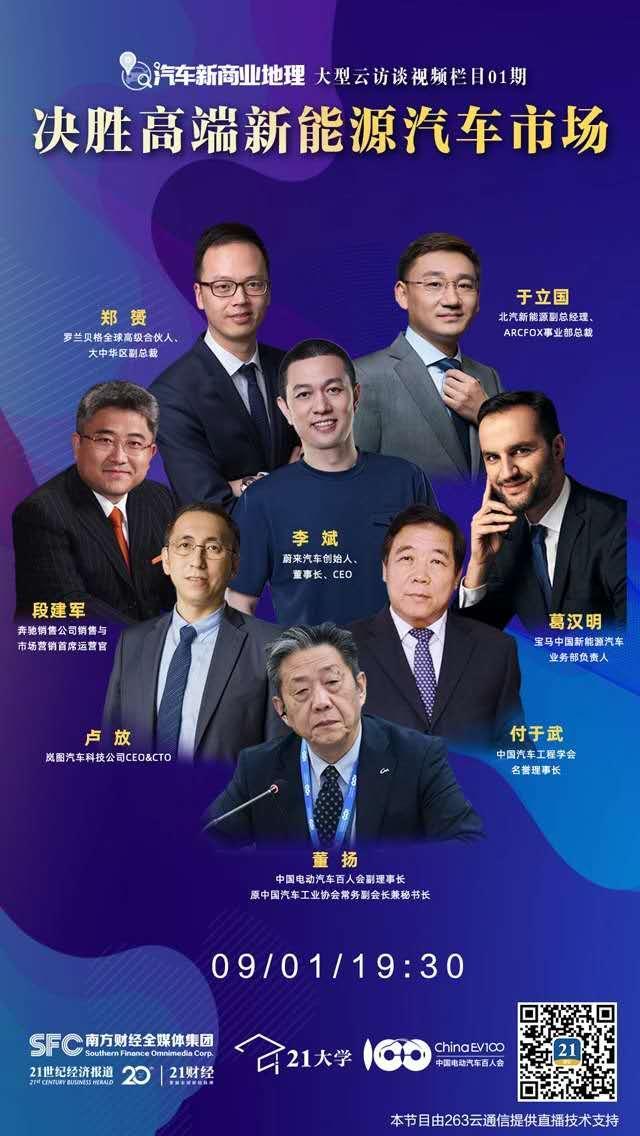 在汽车产业百年不遇的大变革中,9月1日,在由21世纪经济报道、21大学联合中国电动汽车百人会共同出品的大型视频访谈栏目《汽车新商业地理》中,21世纪经济报道记者与中国电动汽车百人会副理事长、原中国汽车工业协会常务副会长兼秘书长董扬,中国汽车工程学会名誉理事长付于武,罗兰贝格全球高级合伙人、大中华区副总裁郑赟3位业内专家以及蔚来汽车创始人、董事长、CEO李斌,岚图汽车科技公司CEO&CTO卢放,北京奔驰销售与市场营销首席运营官段建军,北汽新能源副总经理、ARCFOX事业部总裁于立国,宝马中国新能源汽车业务部负责人葛汉明5位车企高管,共同探讨创新企业和商业模式背后的逻辑与智慧。