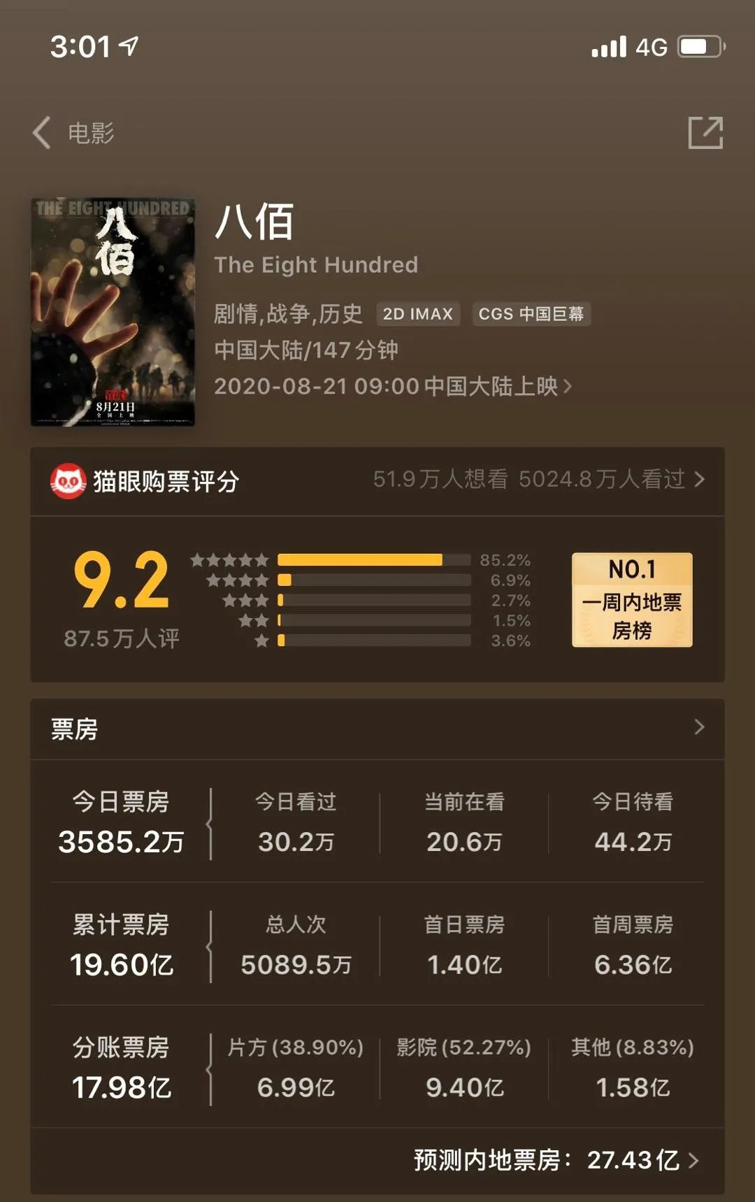 自影院复工以来,最火的电影,当属《八佰》,它的表现超出大多数人的预期,堪称“救市之作”。据猫眼专业版显示,电影《八佰》截至8月31日15点,票房累计19.60亿,观影人次5089.5万,预测票房突破27亿。