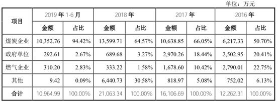 招股书显示,煤炭企业是精英数智的主要客户,2016—2019年上半年,对煤炭企业的销售收入占营业总收入的比重分别为50.70%、66.05%、64.57%和94.42%。政府单位和燃气企业的销售收入占比持续下降。