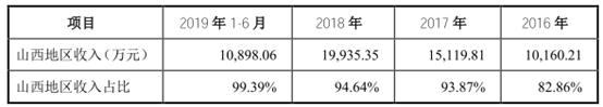 2016—2019年上半年,精英数智在山西地区收入占营业总收入的比例分别为82.86%、93.87%、94.64%和99.39%,而山西地区以外销售收入占比近三年持续下降。