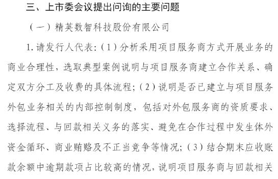 科创板上市委针对精英数智主要针对在项目服务商方式开展业务的商业合理性、应收账款逾期、持续经营能力、核心技术壁垒等四方面问题提出问询。